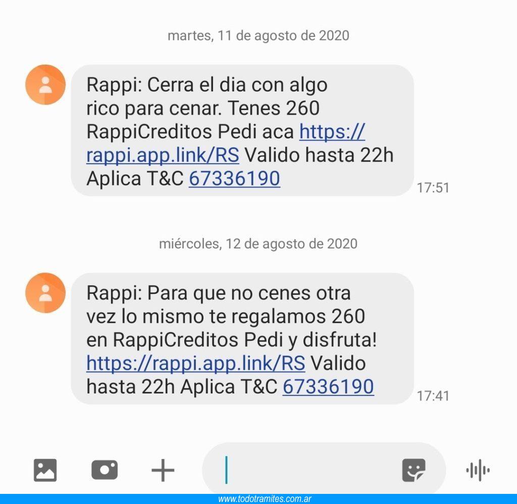 Abajo vas a ver un caso de mensaje SMS mandado por Rappi con créditos para efectuar pedido por un enlace.